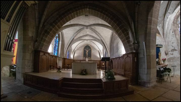 nef de deux travées est bordée de collatéraux étroits. L’ensemble est voûté