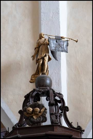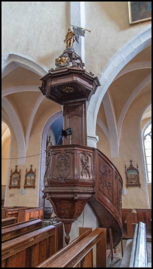 baroque en bois du XVIIIe siècle. L'abat-voix est sommé d'un ange tenant une