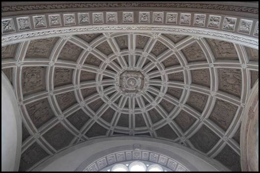 l'arc en plein cintre orné de caissons feuillagés et les pilastres toscans à