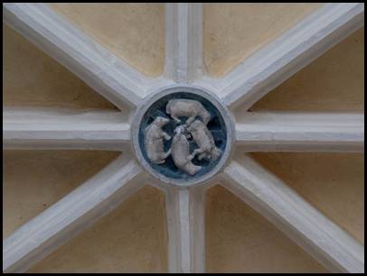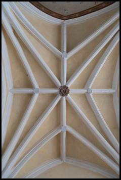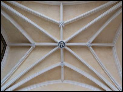 nervures curvilignes descendant d'une clé armoriée et formant cinq pans