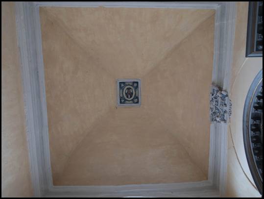 voûte, dite en arc de cloître, repose sur une corniche et s'orne d'une clé