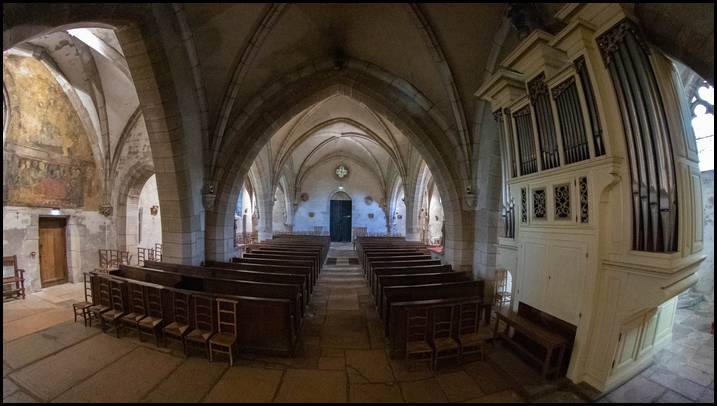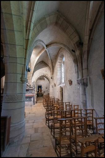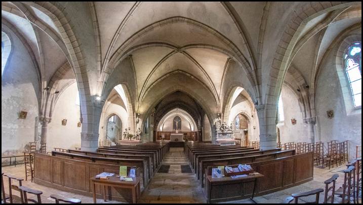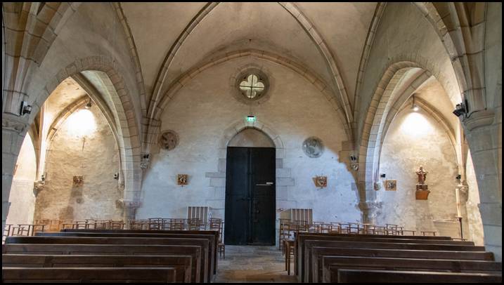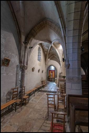 nef de deux travées est bordée de collatéraux étroits. L’ensemble est voûté