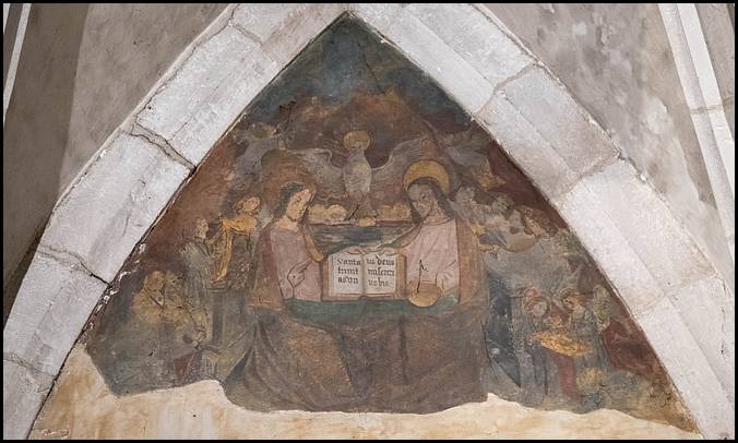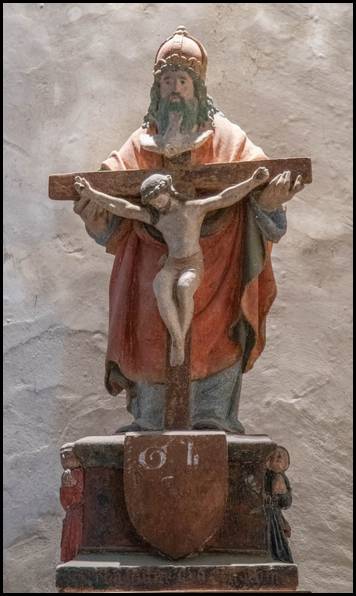 dessus du baptistère, une trinité en pierre polychrome, du premier quart du