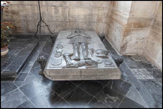 repose sur quatre lions en pierre noir. Il était gouverneur militaire de Vitryet fut tué par les troupes de Henry IV pendant la