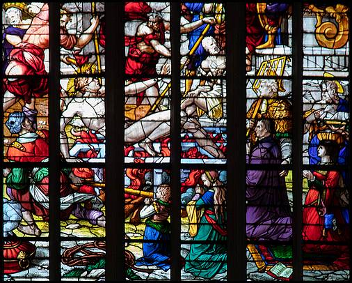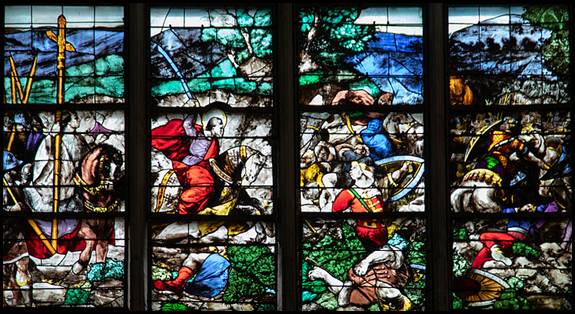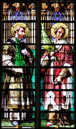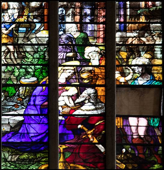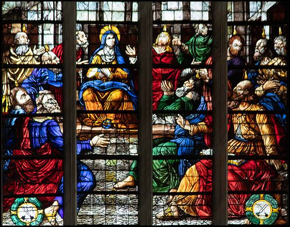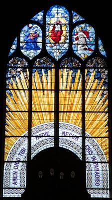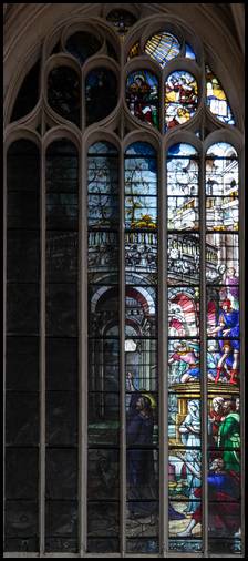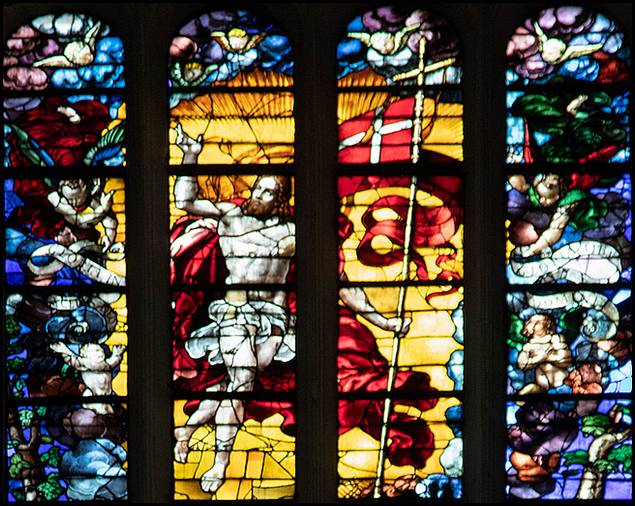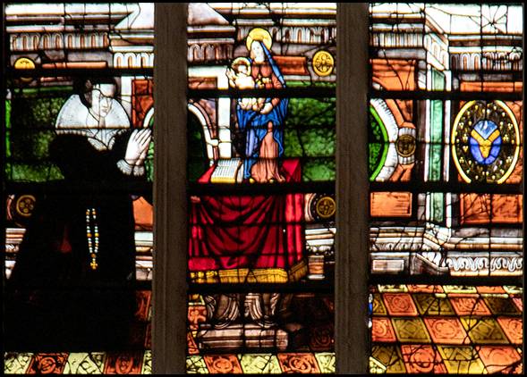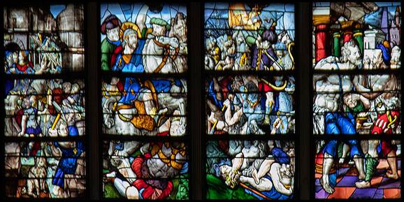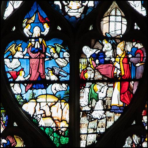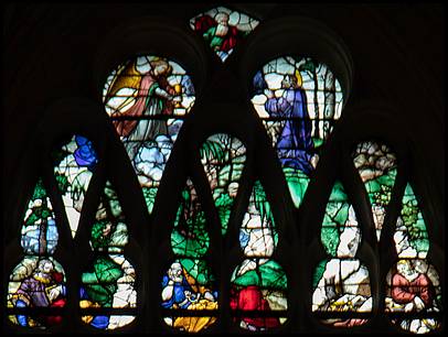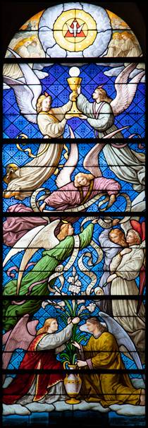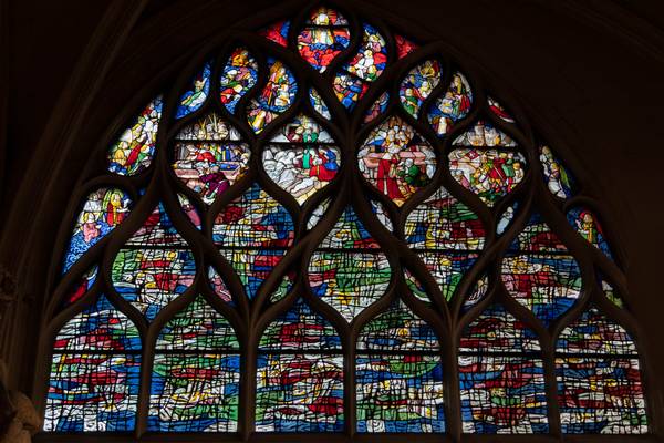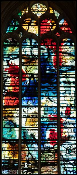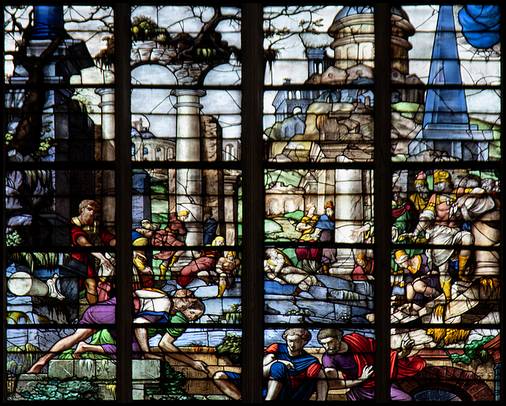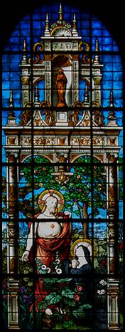 chapelle Sainte Catherine, la verrière réunie trois sujets divers. Vitrail du
