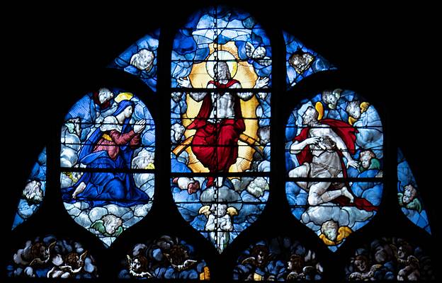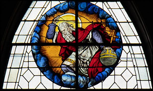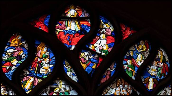 jugement dernier. Verrière ancienne, on peut voir au tympan le Christ entre