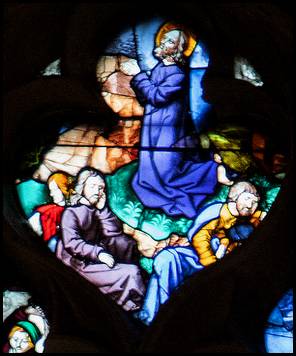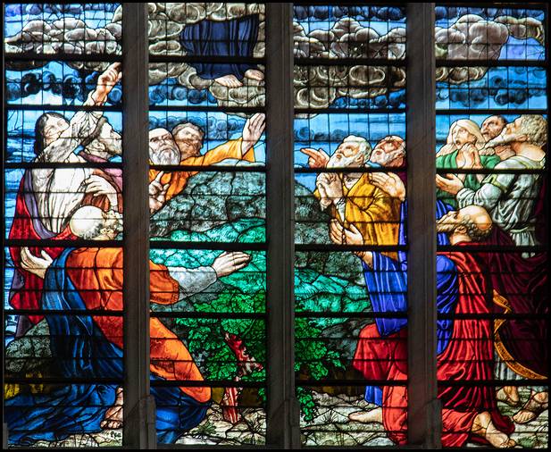 des pieds - Les verrières du transept Le sacré Cœur – Adoration des mages – Moïse et Élie – La Résurrection Les verrières hautes du chœur Martyre de Saint