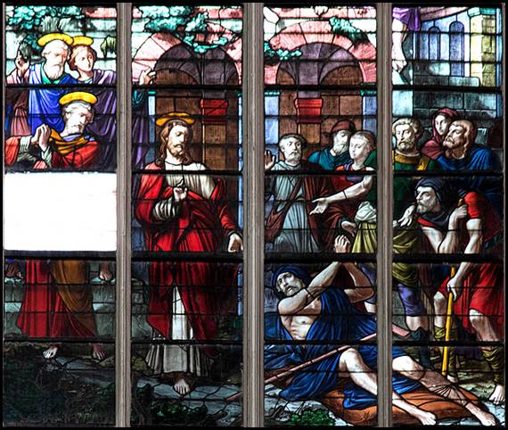 guérissant le paralytique - Vitrail moderne – Personnages en pied Les verrières des chapelles du