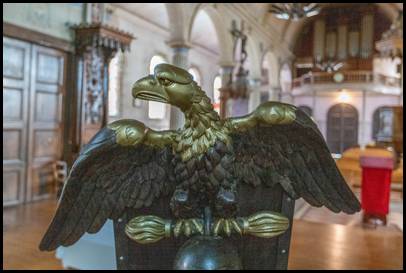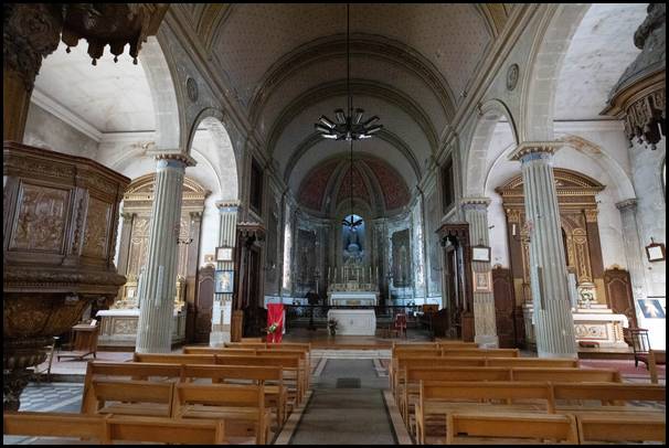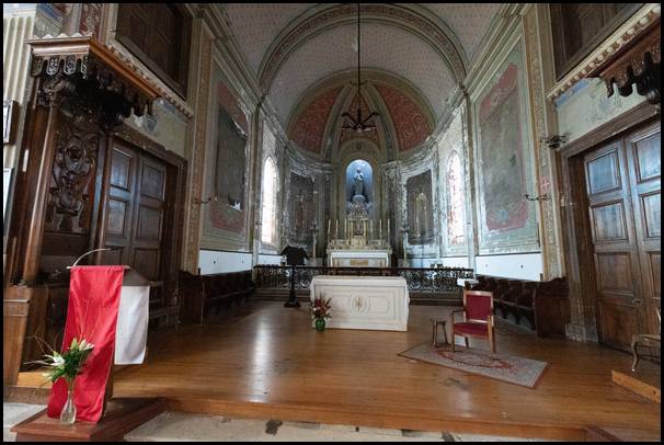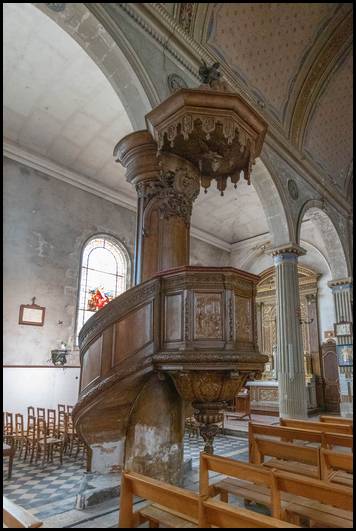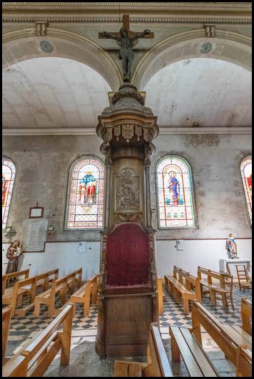 la nef, se faisant face, la chaire et le banc d’œuvre composé d’une seule stalle,