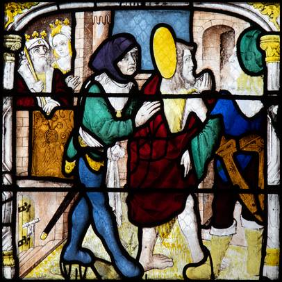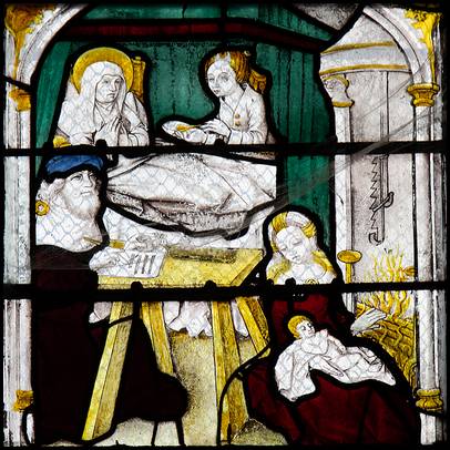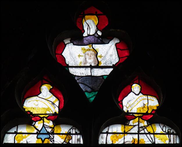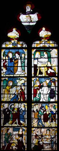 la fenêtre orientale du bas côté nord, un vitrail du XVe siècle avec des scènes