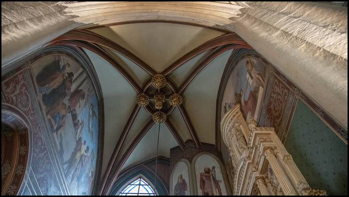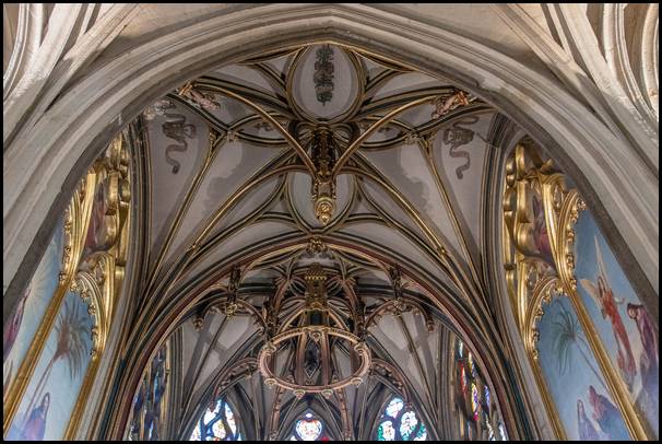 quatre travées est voûtée comme le chœur, mais les clefs pendantes ont été
