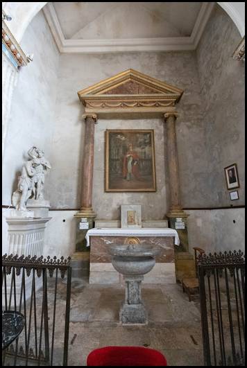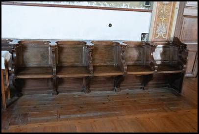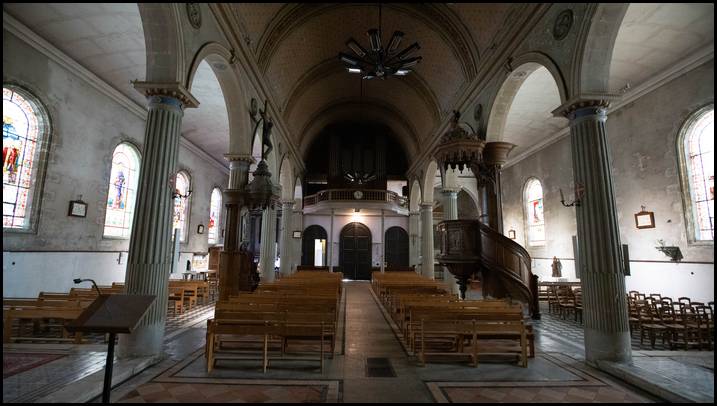 la nef, se faisant face, la chaire et le banc d’œuvre composé d’une seule stalle,